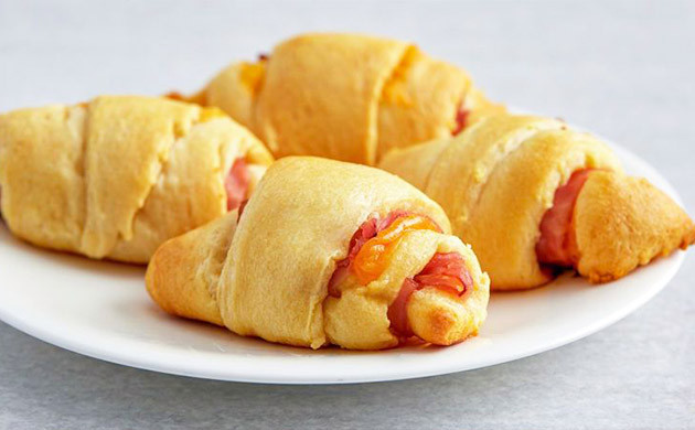 - Круассан-пицца. Если выложить на слоеное дрожжевое тесто колечки пепперони, щедро присыпать это все натертым сыром и свернуть в форме круассана, то получится восхитительная закуска. Представляете, сколько таких штук можно съесть за один присест?