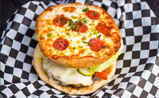- Пицца-бургер, где кроме котлеты, соленого огурчика и дольки помидора на вершине красуется расплавленный сыр и несколько колечек колбасы. Сытно, ароматно и невероятно вкусно.