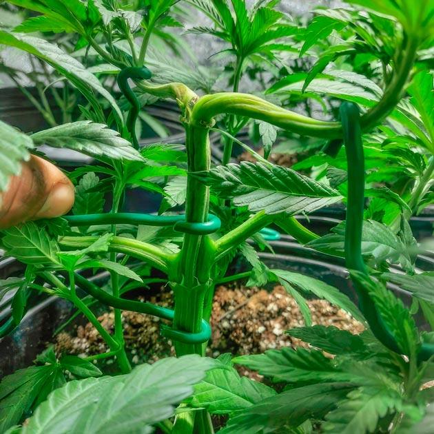 На этой неделе сосредоточился на тренировке кустов с помощью LST-растяжек. После топпинга растения успели восстановиться и начали активно тянуться в высоту, так что самое время было раскрыть их вширь. Аккуратно сгибал основные ветви и фиксировал их практически горизонтально, чтобы равномерно распределить рост и дать свету проникать к нижним ярусам. Честно говоря, думал, что будет сложнее, но стебли оказались довольно гибкими, без проблем приняли нужное направление.
