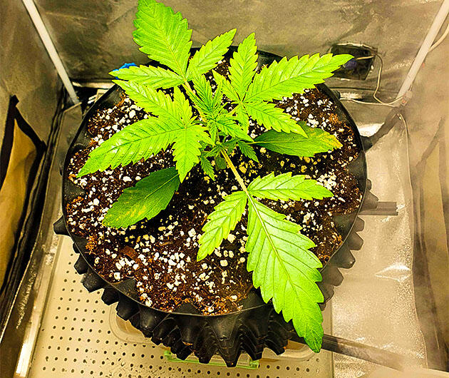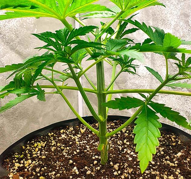 На 20-й день снес макушку, оставив 5 этажей. Первый этаж трогать не стал, ибо хорошо развивается. Также убрал первых нижних 4 листа. После этого дал по листу Grow от Simplex. Скелет у куста хорошо формируется, в полив начал добавлять кремний от Simplex.