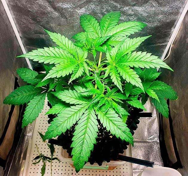 Седьмая неделя роста и вторая неделя цветения. Развел на эту неделю 18 литров компота с pH 5,85. Поливаю по-прежнему руками, т. к. сломался компрессор и пока ремонтируется. Пьет куст по 2,5 литра компота каждый день. Свет на этой неделе 40000-50000 lx, ~ 760-950 ppfd (неравномерный засвет по площади).