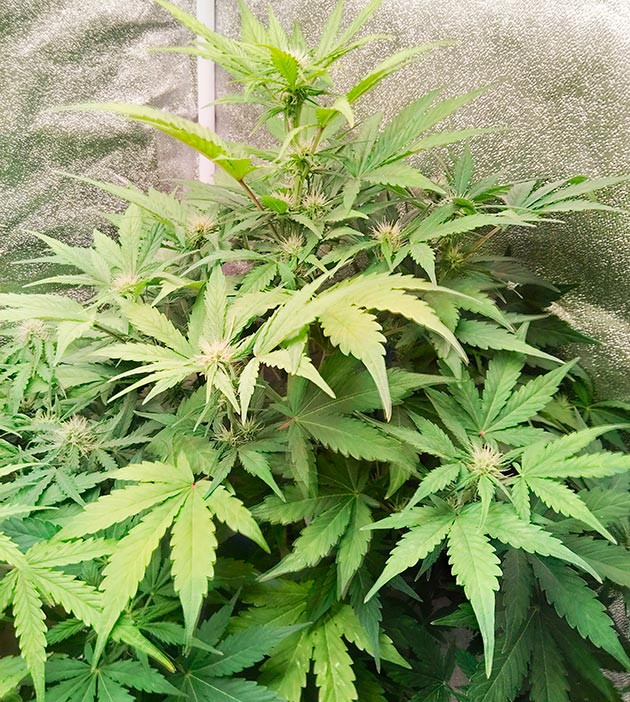 Растишка благополучно зацвела и начала стремительно увеличиваться в размерах. Она растет очень кучно, приходится немного растягивать ветви в разные стороны. В остальном все протекает стабильно, поэтому я не вносил никаких корректировок по удобрениям. На шестой неделе я осуществил LST-подгиб, на который куст прекрасно отреагировал. Соцветия уже стали липкими, а их запах теперь радует легкими фруктовыми тонами.