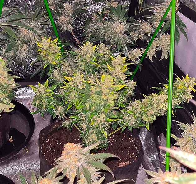 К середине десятой недели растения перестали тянуться. Заметен прогресс по части шишек, они наливаются, становятся плотнее и больше. Расставил в горшки подпорки, чтобы боковым веткам было на что опереться, а то сломаются под весом соцветий. Поливал дважды чистой водой и один раз давал компот, но без CANNA PK 13/14.