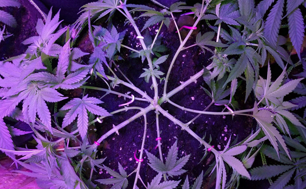 После пересадки в такие большие горшки перестал поливать настолько часто. Каннабис быстро обрастает крупными веерными листьями, так что убираю через день по паре, которые загораживают свет. Также растет и много новых побегов, на тренировку LST кусты реагируют хорошо, форма и структура каннабиса мне очень нравятся.