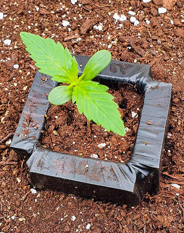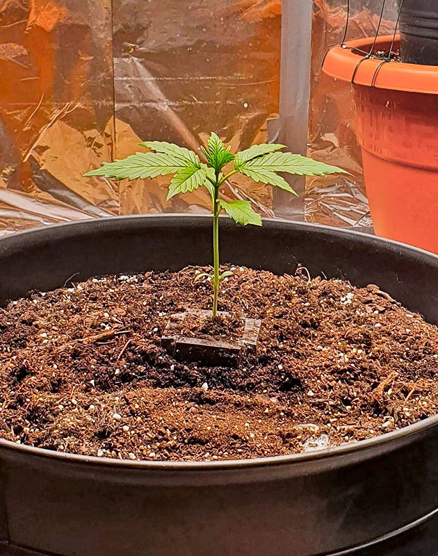 50-литровый горшок оказался слишком большим, поэтому я пересадил росток в другой горшок, на 25 литров. Кустик уже вытянулся до 38 сантиметров и продолжает активно формировать зеленую массу. Расстояние между лампой и верхушкой я решил сделать в районе 60 сантиметров. К концу недели я прибегнул к топпингу, с которым растишка прекрасно справилась, а затем применил LST-подгиб.
