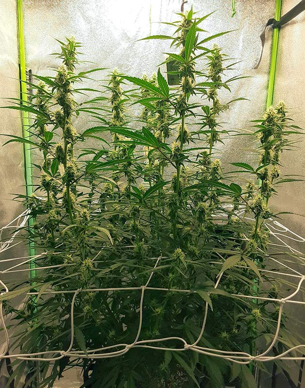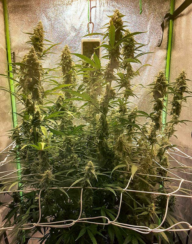 На седьмой неделе я поставил горшок с кустом на стойку из нержавейки, чтобы было проще убирать воду с дренажа. Также натянул сетку ScrOG примерно посередине куста и немного развел колы друг от друга. С этого момента начал давать полную дозировку базовых удобрений: