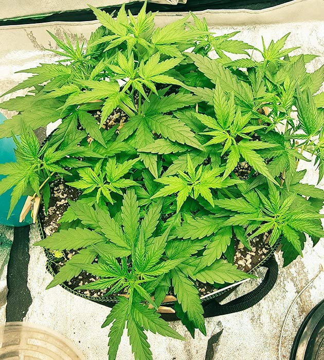 Девочка отлично перенесла топпинг и стрессанула совсем немного. Зато в месте обрезки быстро начали формироваться новые точки роста. С середины недели начал делать LST, чтобы макушка формировалась более широкой. У листвы здоровый вид и цвет, никаких проблем на данный момент. После растяжки полил литром воды с Microbe Brew (2,5 мл/л). Помимо этого, давал ей воду без добавок еще два раза.