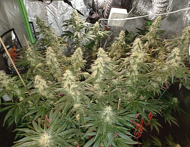 Девятая неделя, перевод в цвет, то есть смена светового режима на 12/12. К этому моменту рост куста по самой высокой коле – 66 сантиметров. Остальные плюс-минус той же длины. На 57-й день полив с удобрениями, Tiger Bloom 2,6 мл/л и Mammoth P 0,2 мл/л. Следующий полив на 59-й день с «КалМагом» и Mammoth P, без «Блума». На 61-й день полив с «Блумом» и через два дня еще один, но уже без «Блума». Получилось 4 полноценных полива за неделю. На 62-й день я заметил, что воздух в палатке очень спертый, а влажность невероятно подскочила. Причина была в забитом предфильтре, из-за чего кустик практически не получал свежего воздуха. Почистил, и всё встало на свои места.