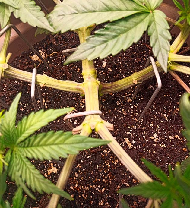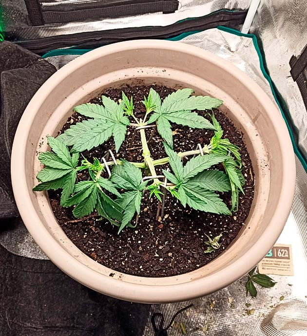 Сделал на каждой из согнутых веток топпинг и фимминг. Таким образом я должен получить по две макушки на двух верхних побегах, на нижних – по 3 и 4. В репортах по этой генетике читал, что кусты прилично тянутся, поэтому постараюсь максимально сдерживать рост. Не люблю слишком высокие растения, да и места у меня не так много. В целом мне очень нравится сам процесс работы с растишкой, так как обычно я гровлю автики, а их особо не потренируешь, потому что постоянно находишься «на таймере» у вегетации, которая может закончиться в любой момент.