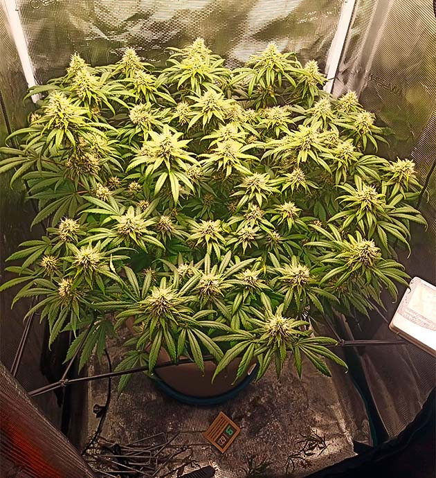 Заключительная неделя вегетации. Кустик отлично разросся, но ему еще предстоит заполнить всю сетку. Удалил небольшое количество слишком большой листвы, также подрезал еще несколько паростков, которые пытаются пробиться на нижних ярусах под сеткой. Также обработал листву спреем от насекомых в качестве превентивной меры. Растиха получила одну порцию компота и после два полива чистой водой. В конце недели переключил свет на 12/12, борд работает на 100 % мощности.