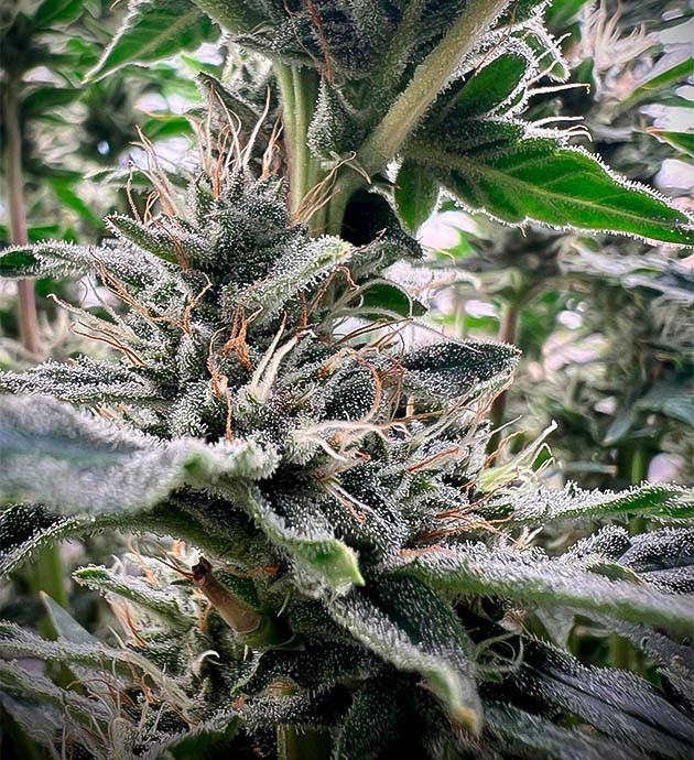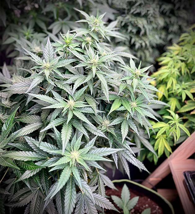 Седьмая неделя, и растишка уверенно тянется, наверстывая упущенное, пока она была «связана» скобами, проволокой и была вынуждена терпеть тренировки. Шишки завязываются, белые волоски группируются в «одуванчики» и будто подмигивают на каждой без исключения макушке. Что касается аромата, то, если постараться различить его в той симфонии, которая царит в гроубоксе, можно почувствовать сладко-травянистый оттенок. Не вишневая кола, конечно, но и не сено с опушки ближайшего леса. Даже в этом лёгком аромате чувствуется «порода». В схеме питания небольшие изменения, начинаем налегать на фосфор:
