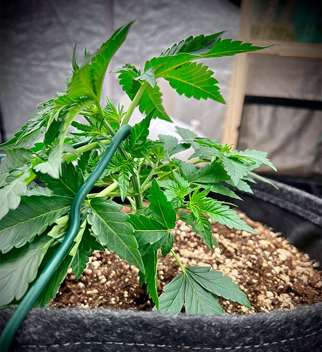 На третьей неделе пришло время приступать к формированию куста. Кто бы что ни говорил, а здоровые качественные автоцветы спокойно переносят топпинг. Вот и Cherry Cola Auto полностью адекватно отреагировала на удаление макушки, перенаправив свои гормоны роста в боковые ветви и начав отращивать две «головы». После топпинга последовал вполне логичный подгиб как основного стебля, так и боковых веточек. Так получилось сделать куст максимально продуктивным. Ну и, конечно, порция «вкусняшек» для хорошего восстановления и здорового развития:
