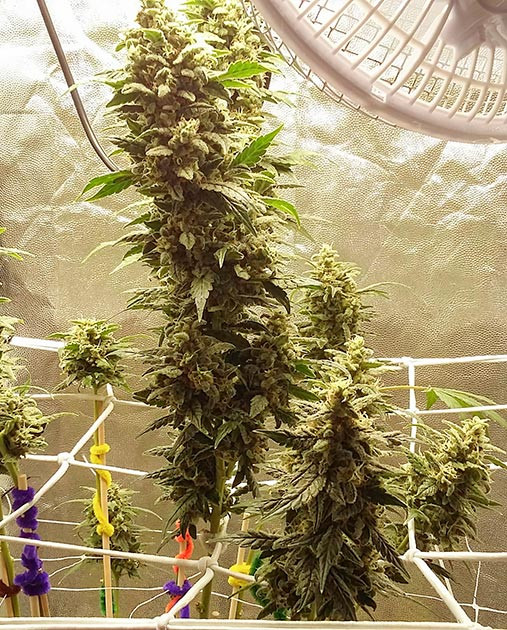 На десятой неделе растиха осталась в гордом одиночестве. Я не упоминал, но вместе с этой семкой я засадил и несколько других. Чего палатку гонять ради одного куста? Остальные уехали в отдельную комнату, которую я давно готовил, и вот свершилось. Ну а «Критикал XXL» дозреет уже здесь. А зреет она достаточно бодро. На шишках появились оранжевые волоски, всё как полагается. Ничего с кустом не делал, поливал, проверял на наличие плесени, хотя взяться ей по большому счету неоткуда, да любовался макушками, каждую из которых подвязал к отдельной палочке-подпорке.