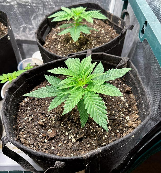 Вторая неделя прошла без особых изменений, кроме появления второй пары листьев. А на третьей я осуществил пересадку в тканевые горшки на 11 литров. Растения выглядят великолепно и пока достаточно однородны. По высоте они уже достигли отметки в 15 сантиметров. Также я начал давать им удобрения на 2 литра воды:
