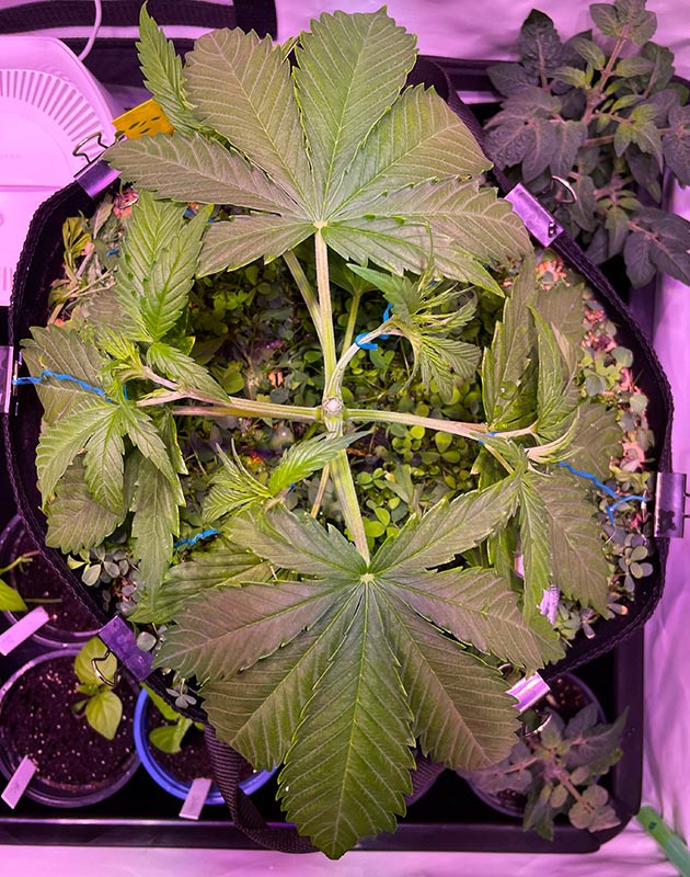 За две недели предцвета растишки заметно вытянулись, не проявляя никаких признаков болезней или дефицита. Поливаю по три литра воды с pH 6,5 по мере просыхания почвы. В конце недели решил сделать на большой девочке технику суперкроппинг, чтобы немного поумерить её пыл, так как она тянулась слишком сильно.