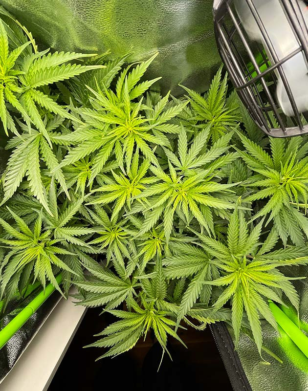 На шестой неделе решил переставить меньшую растишку в другой тент. Там также есть всё необходимое оборудование, свет – Vipar Spectra 95 W. Пришлось повозиться, чтобы не повредить ее во время переезда, но я справился с помощью своей девушки. После этого в обоих тентах натянул сетки скрог. Кусты выглядят отлично: густые, здоровые и пышные.