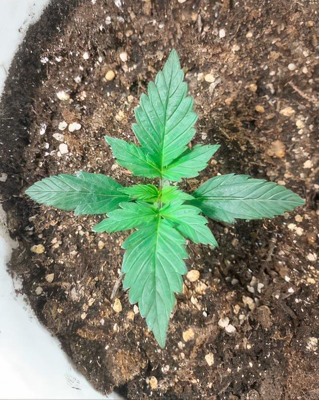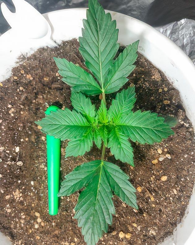 На 9-й день цикла, или 2-й день второй недели, был первый полив литром воды с рН 6,1. Также я решил немного взрыхлить грунт. 11-й день цикла, еще 500 мл воды и по листу «Эпин». Кустик уже выпустил первые боковые лапки. Это настоящий монстр, только пока еще маленький.