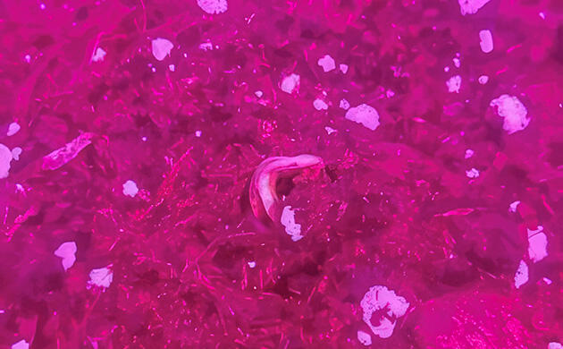 Горшок на 12 литров у меня был тоже экспериментальным, с уймой просверленных отверстий. На дно уложил дренаж, затем пеноплекс, затем сам грунт, который пролил микоризой и «Корневином». После переноса семечки в «гнездышко» горшок был накрыт пленкой и поставлен на подоконник под LED-свет. 26 часов ожидания, и вот уже показался росток, причем уже без каски.