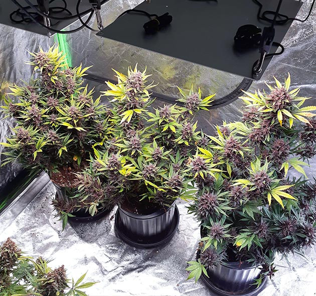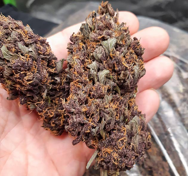 Слов по поводу LSD Auto у меня нет, сплошные эмоции. Я был настолько впечатлен этим сортом, что не могу передать. Во-первых, поднять эти растишки было проще простого. Никаких проблем ни с одной из трех девочек не возникло. Семечки проросли быстро, саженцы прошли вегу за 20 дней, еще 5 недель потребовалось для полного созревания. Во-вторых, такого насыщенного фиолетового цвета я не встречал ни у одного из сортов. Видел бутоны с фиолетовым оттенком, но это даже близко не похоже на то, какими получились соцветия LSD Auto. Тёмно-фиолетовый цвет, почти черный, с красноватыми оттенками. Кусты удивительной красоты, колы большие, плотные, смолистые. Трихомами покрыты даже листья. В-третьих, это очень ароматный сорт. Насыщенный запах появляется уже в конце веги. Ощущается немного дизельный аромат, фруктовый и кислый. К концу цветения запах становится буквально дурманящим. Если понюхать близко, то создаётся впечатление, что даже эффект присутствует. Ну и, конечно, итоговое количество после рубки, маникюра и просушки является огромным плюсом LSD Auto. С трех кустов я получил 470 грамм готового продукта, который отправился на пролечку.