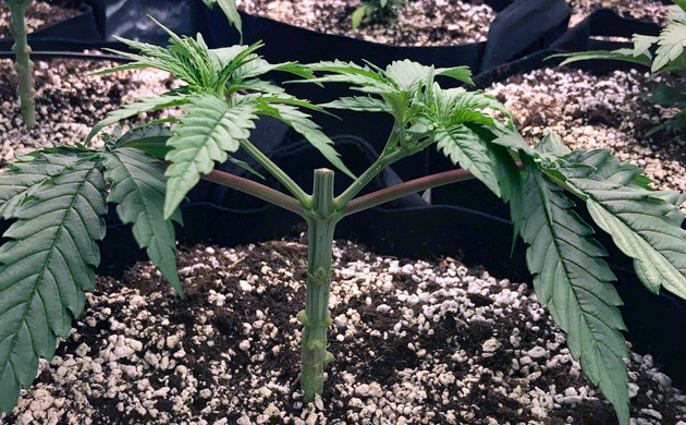На 6-й неделе продолжаю борьбу за идеальную крону и хороший урожай. Убираю второй и четвертый узел на каждой ветви и отсекаю верхушку. В итоге получается по 6 кол на каждой ветви и 12 в целом на кусте. Побеги я фиксирую по технике LST и стараюсь расположить их в горизонтальной плоскости.