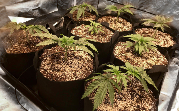 В конце недели выполнил пересадку в большие тканевые горшки, используя грунт BioBizz All Mix вперемешку с перлитом. У меня не хватило крупных двадцатилитровых горшков на всех и пришлось на время посадить три куста в более мелкие емкости.
