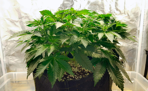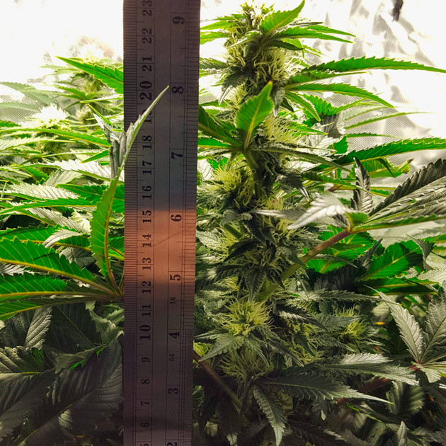 С девятой недели увеличил полив до 5 литров в сутки, растиха не проявила никаких признаков перелива и с удовольствием впитывает такое количество воды с удобрениями. Кустик заметно прибавил в росте. Его размер составлял 55 сантиметров. Осталось еще немного тренировок, возможно, суперкроппинг, а также аккуратно распределить колы в ячейки сетки, чтобы заполнить всё пространство.