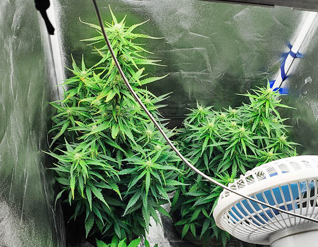 Растения получают одинаковое количество питательных веществ, но цветут по-разному. Больший куст требует больше фосфора и кальция. На шестой неделе на шишках стали виднеться первые трихомы, а у девочек Stardawg Auto появились две маленькие соседки. Постепенно сокращаю количество Shortflowering powder и повышаю концентрацию Booster. PPM компота 950. Заменил маленький вентилятор более мощным, так как маленького мне показалось недостаточно.