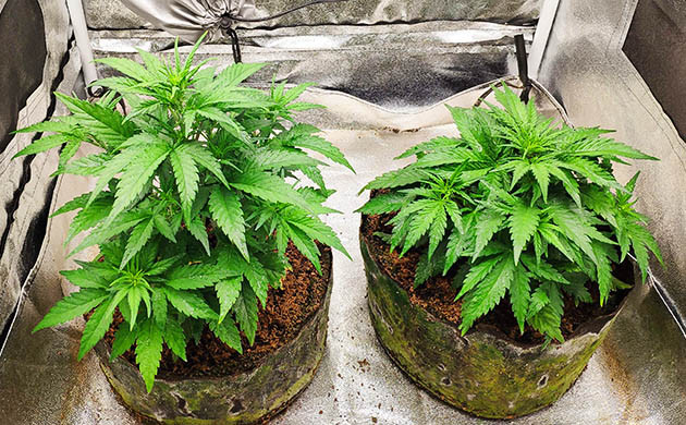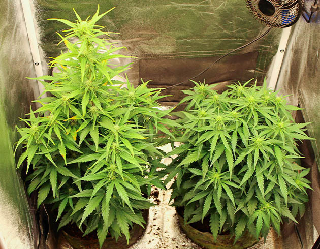 На пятой неделе куст повыше начал активно цвести, тогда как второй переходил в цвет не так интенсивно. К концу недели на обоих красовались шишечки-одуванчики. На высоком кусте появились признаки дефицита кальция, хотя на втором таких признаков нет. Начал давать Booster и Calcium, одному – для восстановления, другому – для профилактики. Кустики подрастают на 1,5-2 см каждый день, поэтому постоянно поднимаю лампу, держа ее на расстоянии около 20 сантиметров от макушки. Удалил с растений немного листвы, в основном веерные лопухи. Добавил в палатку небольшой вентилятор для обдува. Температура в боксе на данном этапе 27 °C днем и 20 °C ночью.