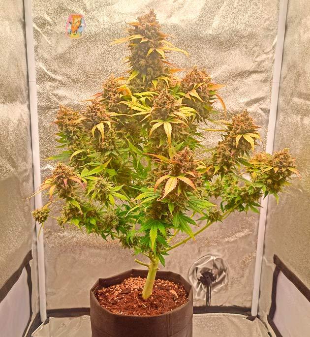 Кустик приятно выглядит, как будто осень началась. Большая часть листьев вверху желтеет, где-то краснеют, внизу зеленые. Еще недельку подержу, пару раз Bloom и чистой водой пролью и под нож. Выглядит неплохо, бошки жирненькие, получше «Флориды» на вид. Были бы досветы еще, вниз кинуть их, чтобы нижние колы тоже свет ловили, и вообще супер. Наверное, докуплю на следующий раз.