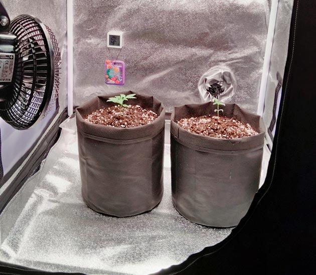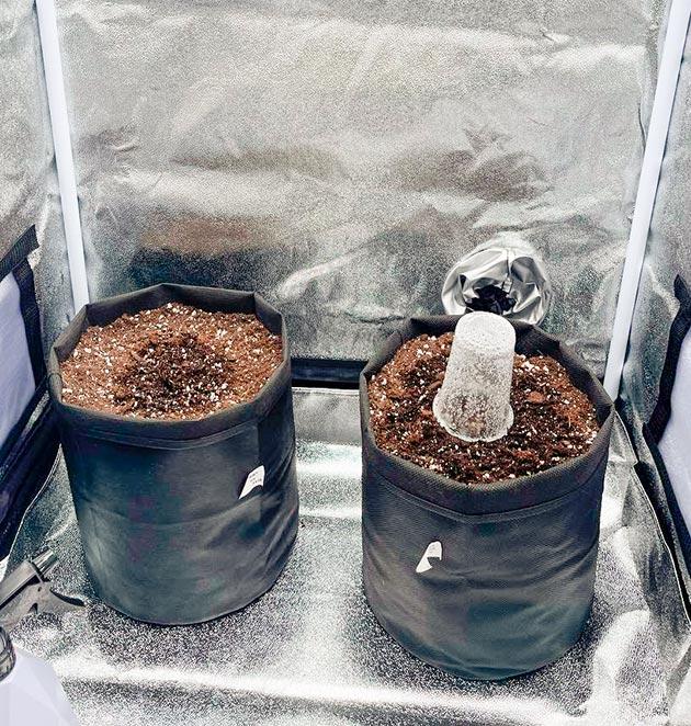 Также немного озадачен появлением белых пятен на гроубэгах. Они вроде и раньше появлялись после полива, но на дне и совсем немного. Надеюсь, что это не плесень, но пока спустил вентилятор вниз, чтоб горшки обдувал.