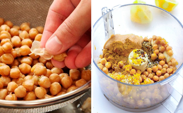 Слегка остывший нут необходимо избавить от оболочки (она может испортить текстуру готового блюда, сделав его не таким нежным и однородным), добавить лимонный сок, чеснок (измельченный), соль, тахини, оливковое масло и немного воды. Все перетирается в блендере, а вода добавляется по мере необходимости для регулирования консистенции.