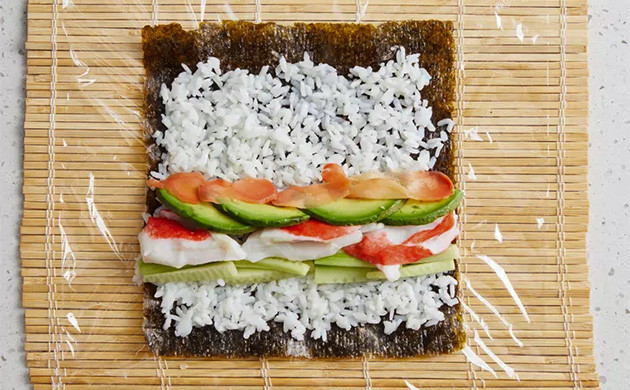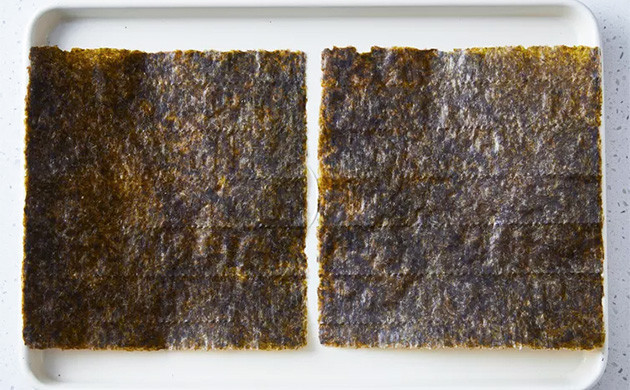 - Разложите лист нори на коврике для роллов или чистой поверхности (рекомендуем использовать именно коврик для роллов).