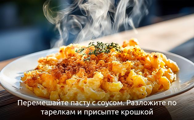 • Хрустящая запечённая корочка? Легко! Если хочется больше запечённой текстуры, то выложите готовые мак-н-чиз в жаропрочную форму, посыпьте крошкой и поставьте под гриль (или в духовку на режим верхнего жара) на 3-5 минут. Следите, чтобы крошка не подгорела, достаточно лёгкого золотистого цвета и хруста.