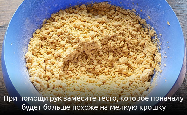 • При помощи рук замесите тесто, которое поначалу будет больше похоже на мелкую крошку.
