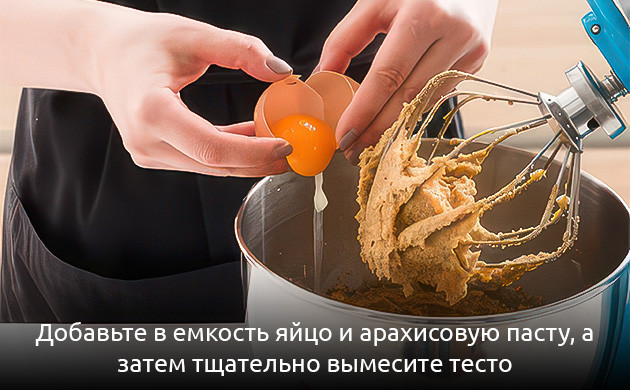 • Добавьте в емкость яйцо и арахисовую пасту, а затем тщательно вымесите тесто до получения гладкой пластичной консистенции. Если масса не схватывается в единый комок, то можно добавить чайную ложку ледяной воды.