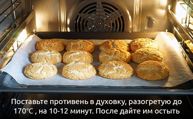 • Разложите шарики из теста на противне, застеленном пергаментной бумагой, а сверху придавите их дном стакана или ладонью.