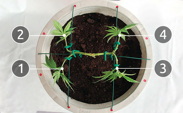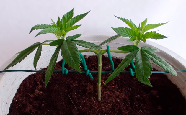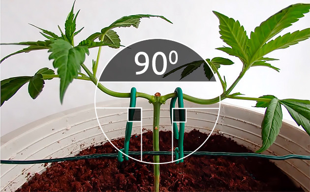 • Из оставленного узла должны исходить два новых боковых стебля. Ваша задача будет зафиксировать их под углом 90° к центральной коле. Подгибать стебли нужно аккуратно и не спеша. Не все сорта каннабиса легко переносят тренировки, какие-то ветви более хрупкие и попросту не перенесут резких движений. Даже если в процессе подгиба стебель надломился, зафиксируйте его в нужном положении, используя скотч или шнурок. Со временем он может прирасти обратно. Чтобы зафиксировать побеги, лучше использовать нетравматичный материал. Это должна быть достаточно толстая проволока в оплетке. Слишком тонкие нитки, лески или проволока могут передавить побег и препятствовать поступлению питательных веществ.