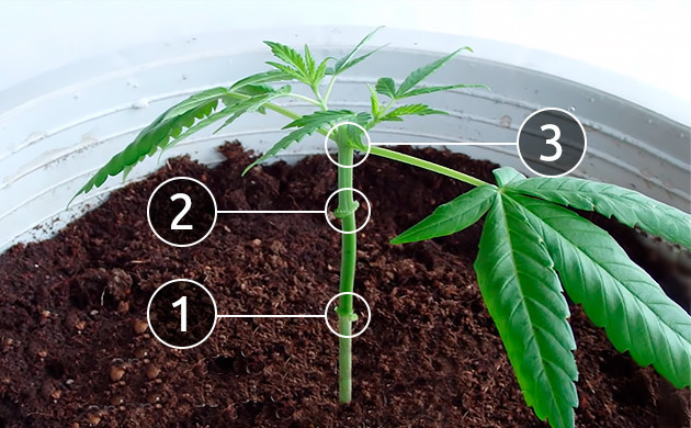 • После прорастания семян дождитесь, пока куст сформирует 5-6 узлов. Некоторые гроверы начинают растягивать коноплю чуть ли не с первых листьев, но на тот момент у нее еще нет достаточно сил и зеленой массы, чтобы быстро оправиться. Затягивать с началом тренировки тоже не стоит, ведь следующим этапом в любом случае будет обрезка. Работать лучше с молодым, но достаточно окрепшим растением. Ни в коем случае нельзя выполнять мейн лининг на цветущем кусте конопли.