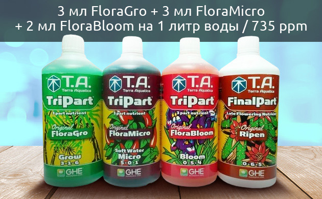 Поначалу все это может показаться очень запутанным, но, на самом деле, все максимально просто. Давайте разберем методику на конкретном примере. Допустим, вы выращиваете каннабис на комплексе удобрений Flora Series от GHE. Схема приготовления питательного раствора в соответствии с инструкцией такая: 3 мл FloraGro + 3 мл FloraMicro + 2 мл FloraBloom на литр воды. Готовим смесь по заданным параметрам и замеряем электропроводность. Вышло 735 ppm.