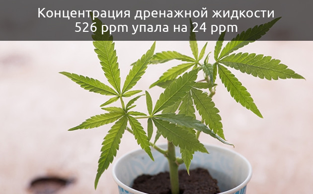 Перед тем как залить раствор, вы замеряете ppm своего дренажа и замечаете, что с последнего замера в 550 ppm у вас растение скушало 24 ppm и дренажная жидкость имеет концентрацию 526 ppm. Отсюда вы делаете вывод, что растение голодное и активно усваивает питательные вещества. Однако если дать ему раствор в исходной концентрации, как рекомендует производитель удобрений, будет слишком резкий скачок. Поэтому мы из емкости с раствором выливаем часть жидкости в другую посуду и разбавляем ее водой до 580 ppm, смотрим по стадии роста и корректируем pH. Делаем записи и поливаем растения. Благодаря такому подходу каннабис получит увеличенную концентрацию солей, которая не приведет к блокировке элементов и в то же время удовлетворит его аппетит.