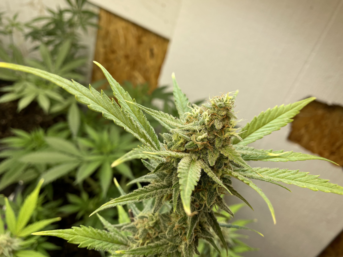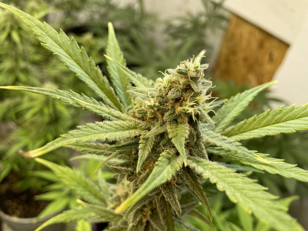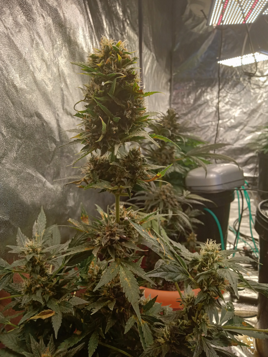 Понравился эффект , хорошо растет , при лст нарастил до цветения 15 веток , штук 6 обогнали центральную , остальные тоже плюс минус вровень. Рост вышел 80 см , несмотря на жару в боксе за 30 и кривой пш. Трихомы везде на листьях и снаружи и снутри , куст обсыпан снегом, прям весь белый. Щипал его с голодухи немного по итогу сухого вышло 85 гр. Кормил гхе на кранухе , жрет всё , сколько ни налей, горшок 15 литров, рос три месяца.