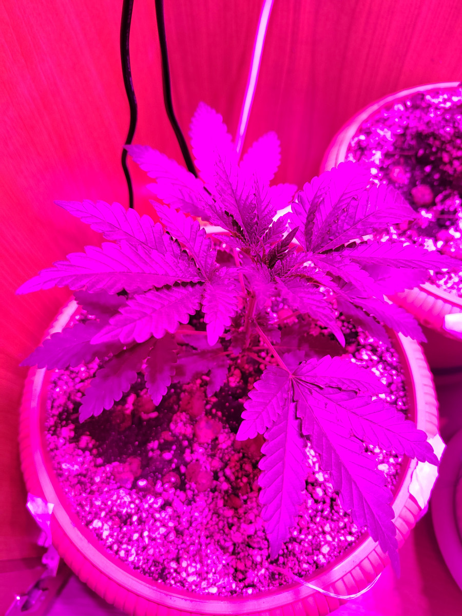 Два из двух проросли. Уже месяц на веге, рост около 30 см, на вид листья индичные. Кусты раскидистые. Генетика отличная, нет отличия в фенотипах. Руки кривые, пересадил спустя три недели. Сначала в литровых горшках росли. Теперь растут в 10 литровых. Издевался над кустами из-за собственной безграмотности, часто опрыскивал листву, боялся что влажность низкая, как-никак зима на дворе, воздух сухой в доме. Грунт роза, перлит, керамзит. Подкормка на веге минеральная, реагируют адекватно. Свет 400 Ватт (светодиоды по 50 ватт). 80/60/220