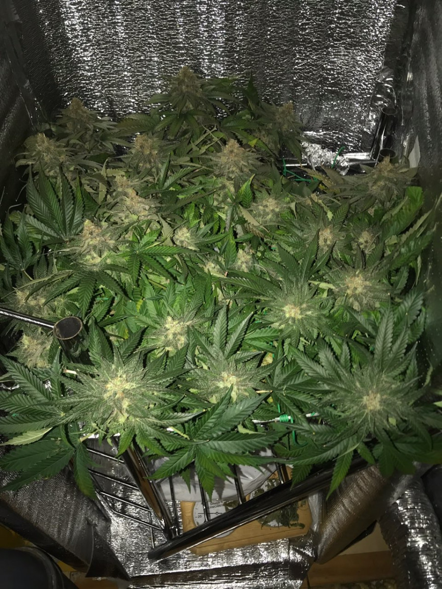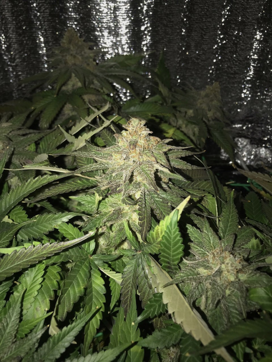 Решил гровить в ауте, но в 20 литрах. Выросла 1,5-метрая растишка. Пила много, ела нормально. Кормил минеральными трай-парт. Зацвела в середине августа. В сентябре пришлось занести в теплицу. Харвил во второй половине октября. Вообще все без проблем. Запах в теплице стоял землисто-сладкий. Частые проветривания пошли на пользу – смолы появилось больше и оттенок стал изумительным.