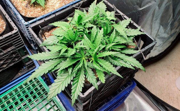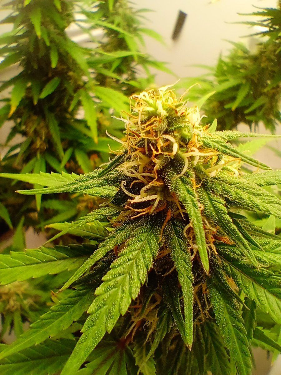 К концу 3 недели она уже стала достаточно крупной и поэтому была пересажена в горшок побольше. Были еще топпинг и дефолиация. И что я вам скажу: сорт хоть и автоцвет, но в опытных руках нормально, как фотик, переносит даже HST, только вега удлиняется. В конце пятой недели был LST для каждой веточки и дефолиация. Никаких негативных изменений в растении вообще не происходило. Тогда же, после манипуляций, начал появляться запах, а также признаки предцвета. В 6 недель малышка зацвела полноценно.