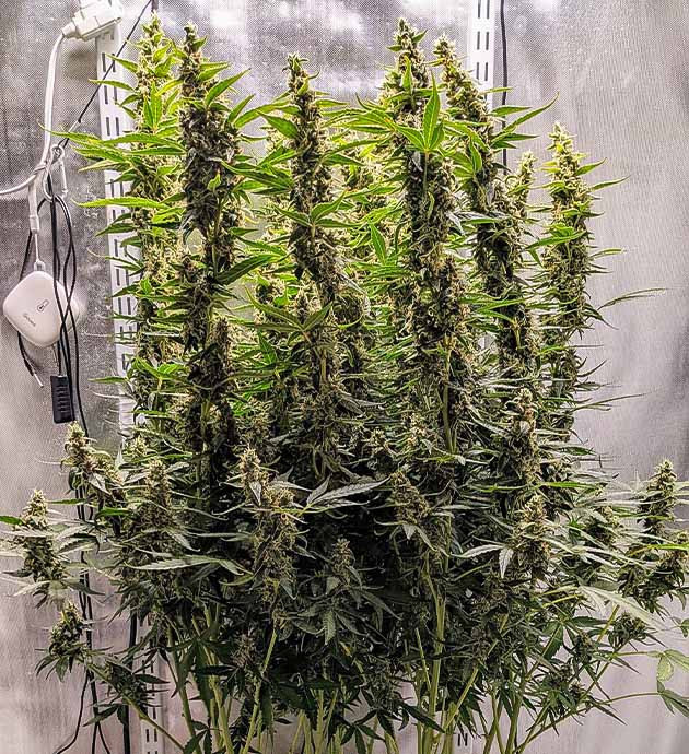 В 3 недели начал подгибать, чтобы распушить крону и сформировать больше точек роста. Развитие шло как нельзя лучше. 4 недели – куст уже практически сформировался и вообще не выказывал никаких признаков стресса или дефицита. В 5 недель растиха перешла на цветение без каких-либо затупов. В 8 недель стало понятно, что харвест не за горами. Рост растихи прекратился. Шишки наливались так, что от них хотелось откусить кусок немедленно. Аромат, трихомы, размеры – сложно было удержаться. 11 неделя была последней, промывочной, и в 12 недель, после 2 суток темноты, джелатик был срезан.