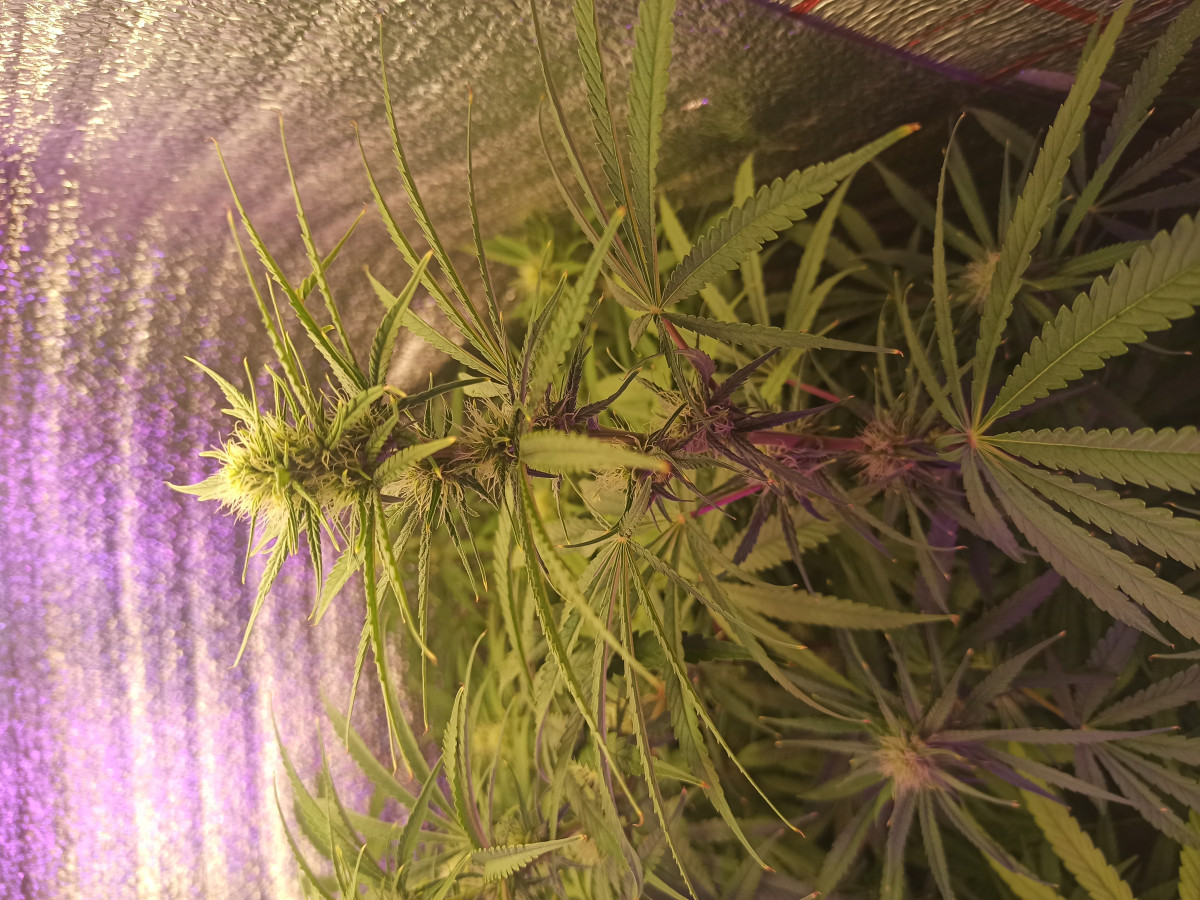 Зацвела, соцветий как правило очень много, но они не плотные. Как я понял это какой-то сативно-экваторный ген, из-за которого шишечки не на столько плотные как с классической индики, все из-за того что там очень жарко, и такое свойство вызвано банальной адаптацией да бы соцветия не гнили внутри. Шишки кстати очень и очень смолянистые, генетика гориллы.