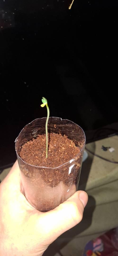 Всем салют! Это мой первый опыт в ботанике. Замочил семечку по инструкции в воде с перекисью 6.12.25. Проросла на вторые сутки, чуть больше самой семки, 8.12.25 посадил её в землю(кокосовый субстракт) в отрезанную 0.5л. бутылочку, сверху накрываю отрезанной от неё же верхушкой, чтоб был парниковый эффект, периодически открываю, чтоб подышала. 10.12.25 уже вылез росточек. На сегодняшний день(14.12.25) выглядит вот так (см.фото). Все эти дни не поливал, так как субстракт неплохо увлажнил перед посадкой и видно что до сих пор ещё сырой. День/ночь- 18/6. Лампы фитомодуль(60W) 2 шт, по 4 модуля как на фото. Гроубокс высота-1.2м. Ширина-1.2м. Глубина- 0.5м. Скажите пожалуйста, нормально он развивается или может что то не так делаю? Дайте совет какой, если что не так😊