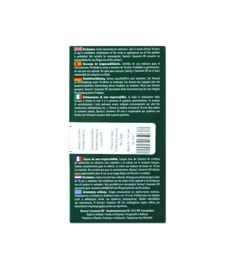 Insane OG – это результат работы легендарного тандема Barney’s Farm и B-Real из Cypress Hill. Этот сорт с 32 % ТГК объединяет генетики OG Kush, Bubba Kush и Granddaddy Purple, раскрывая насыщенный аромат старой школы с нотами дизеля, специй и винограда. Энергия, вкус и сила в одном флаконе.