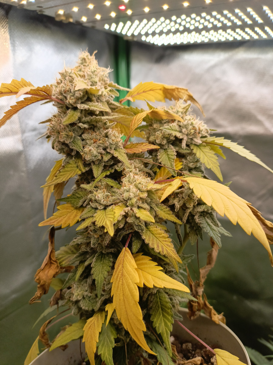 Это монстр силы! Так вышло, что из-за испортившейся погоды пришлось снимать урожай всего на 7 неделе цветения. Пусть вкус и запах оставили желать лучшего, но с ног сбивает уде мама не горюй. Отличная индика.