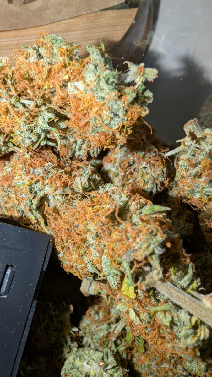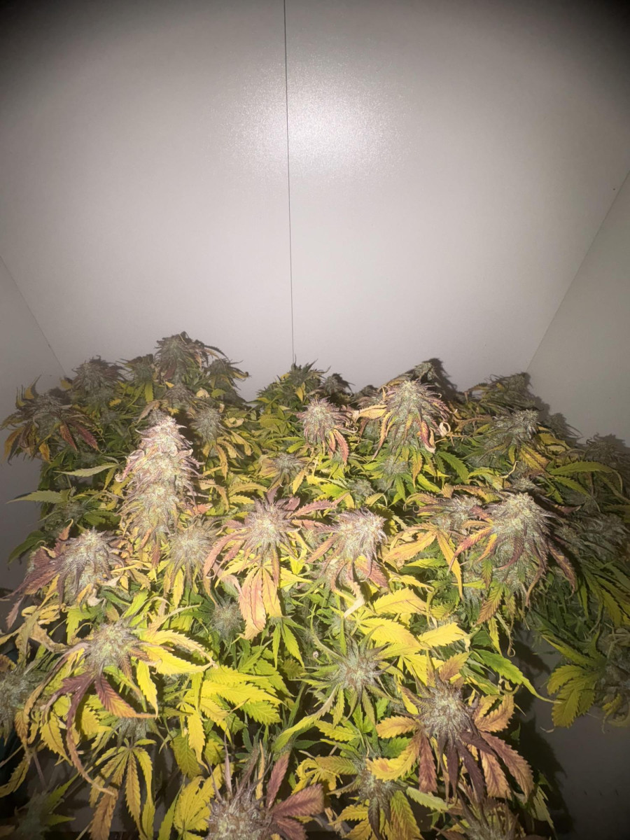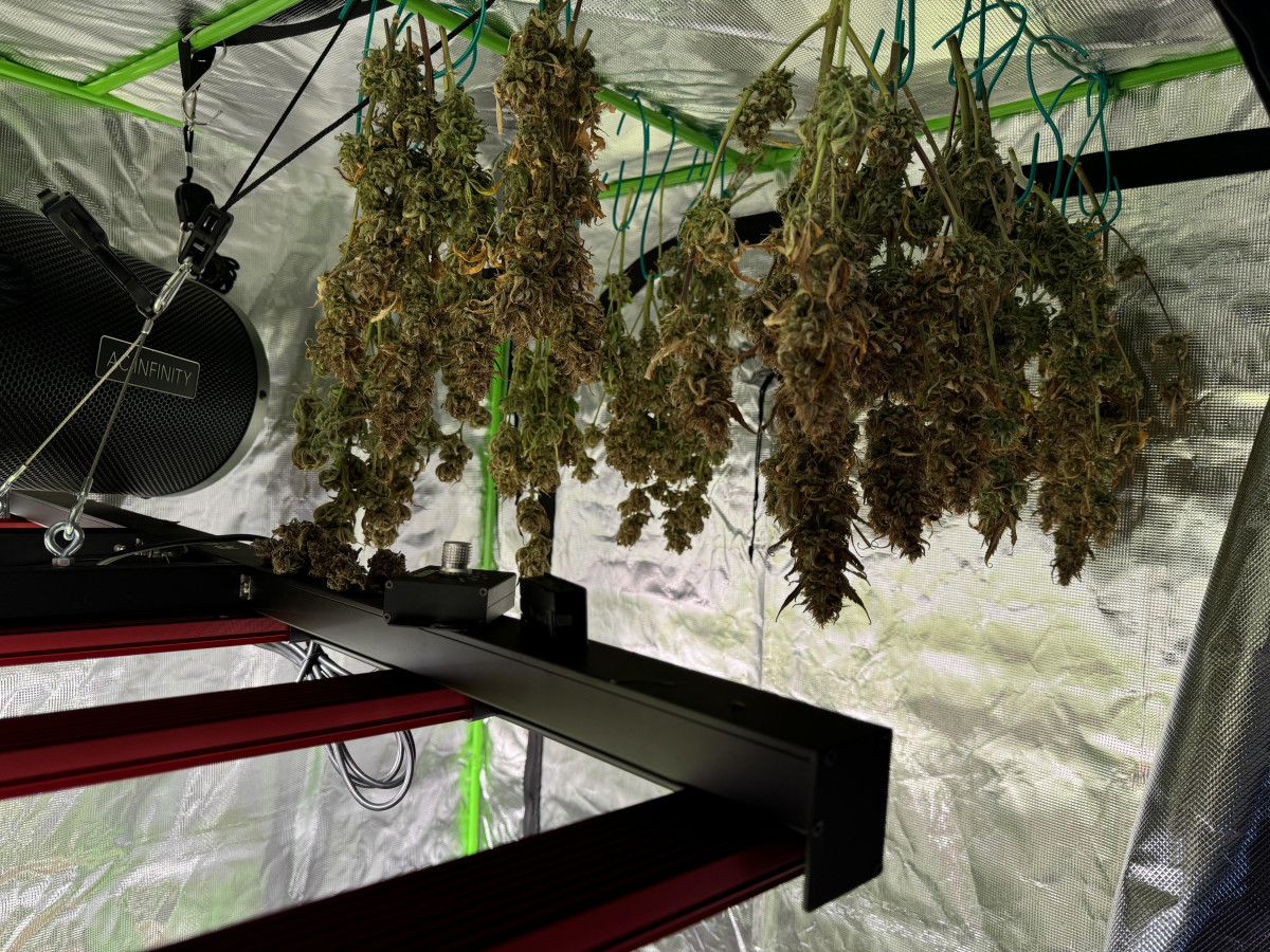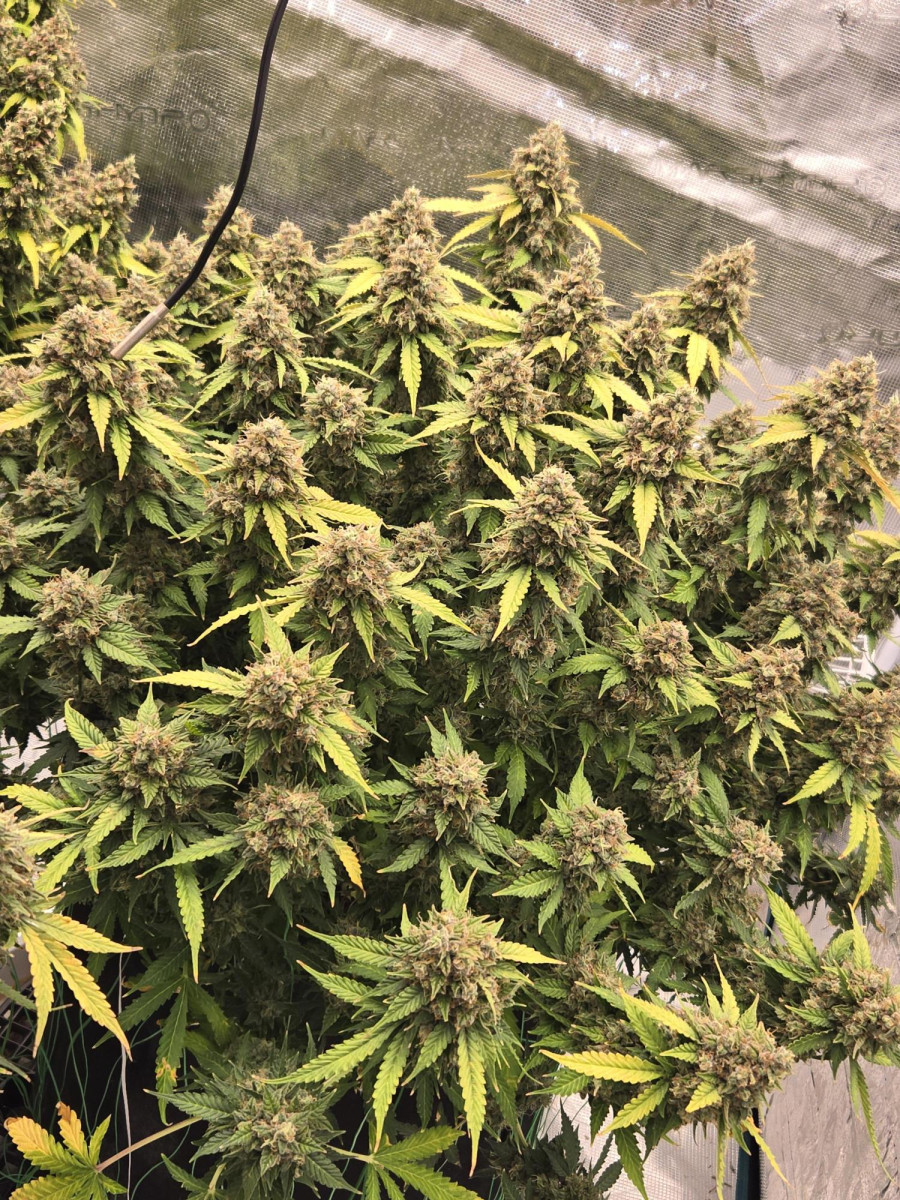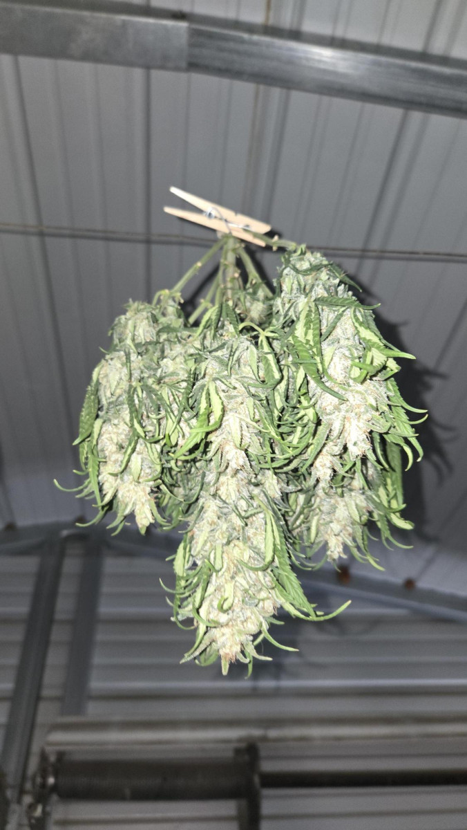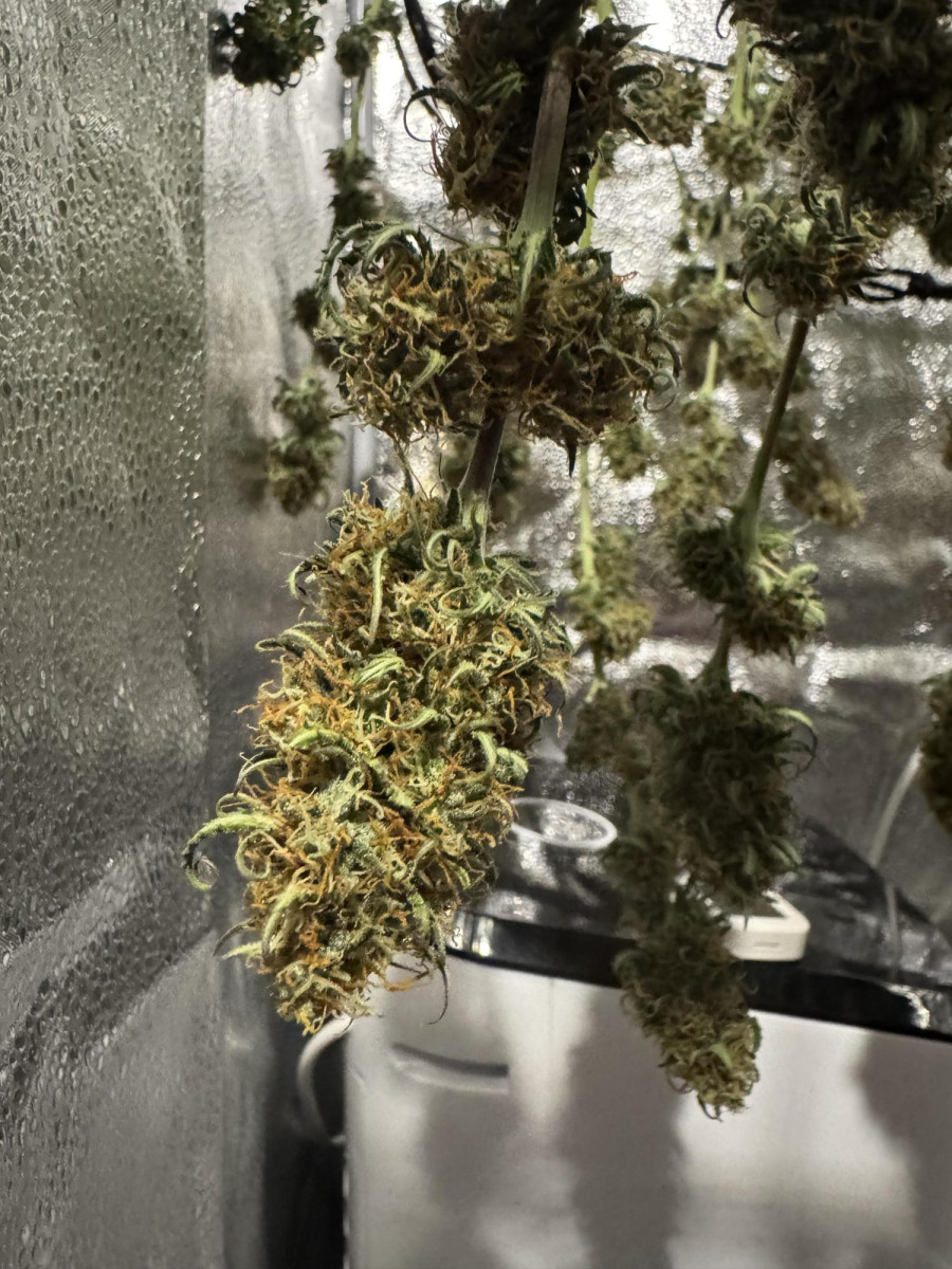 Сушка проходит хорошо при температуре 15-17 градусов по Цельсию. Влажность 58-62%, начал обрезать 1 растение после 12 дней сушки. Запах потрясающий, сильный цитрусовый аромат, и я чувствую немного сосны. Я дам отчет о дыме после того, как он просохнет как следует, хотя мне уже трудно удержаться.